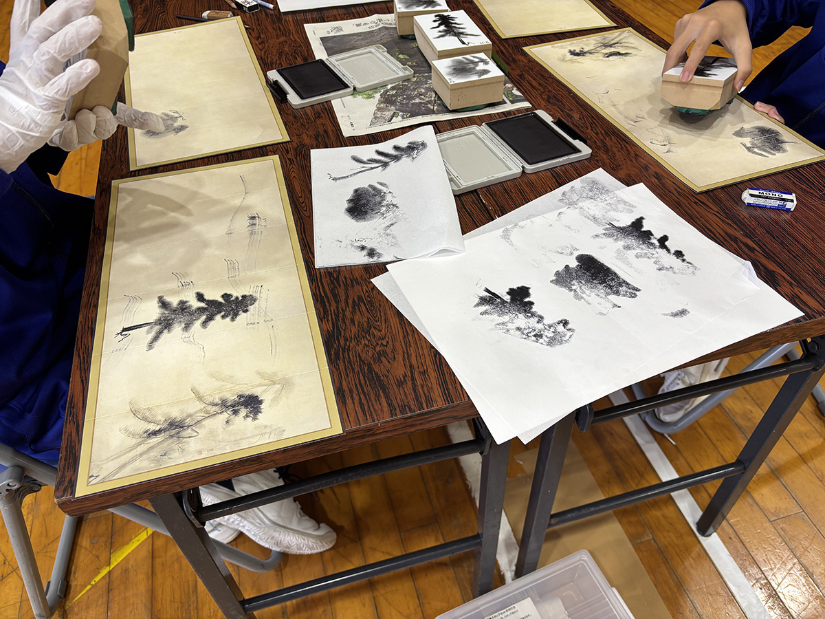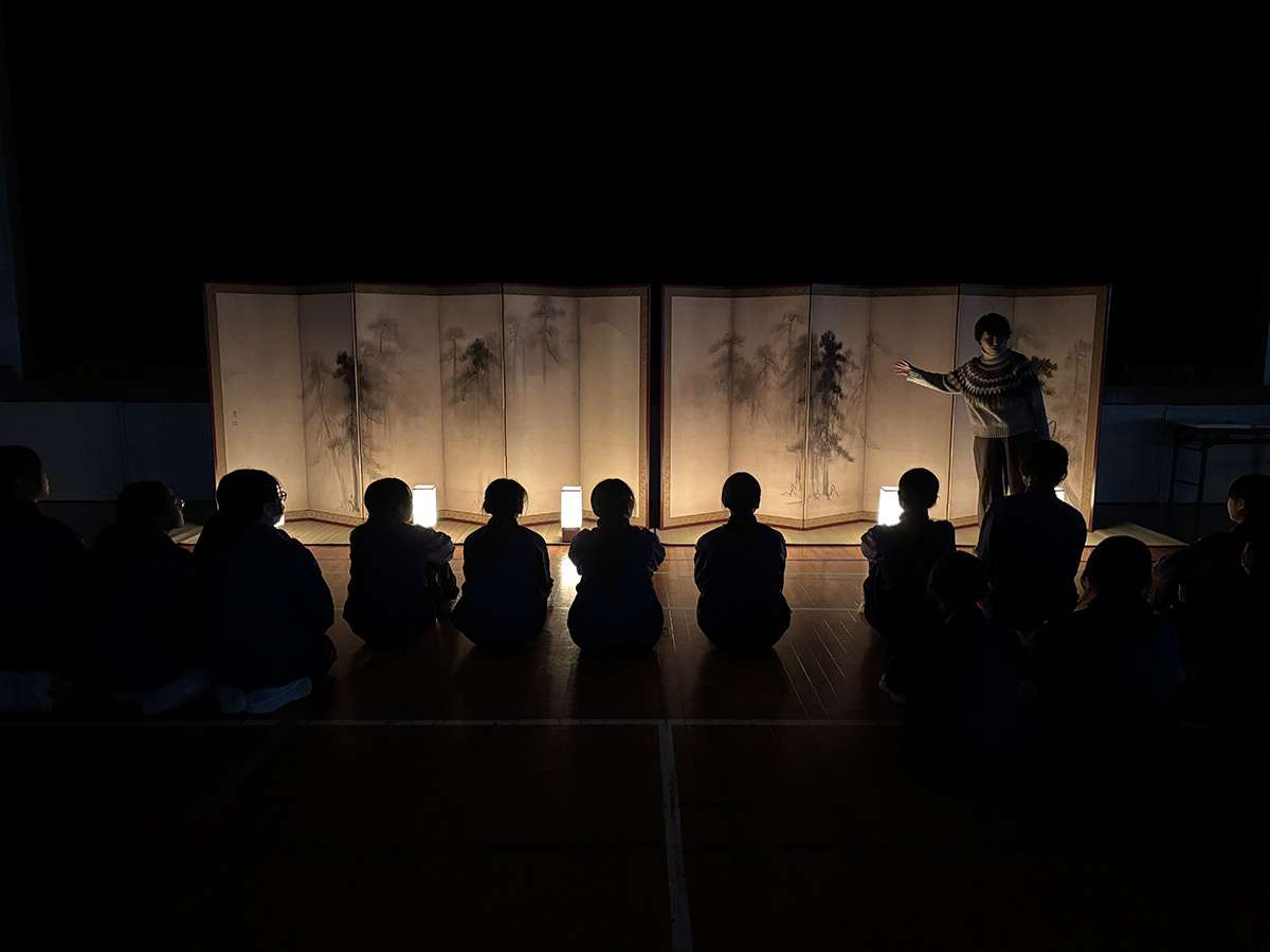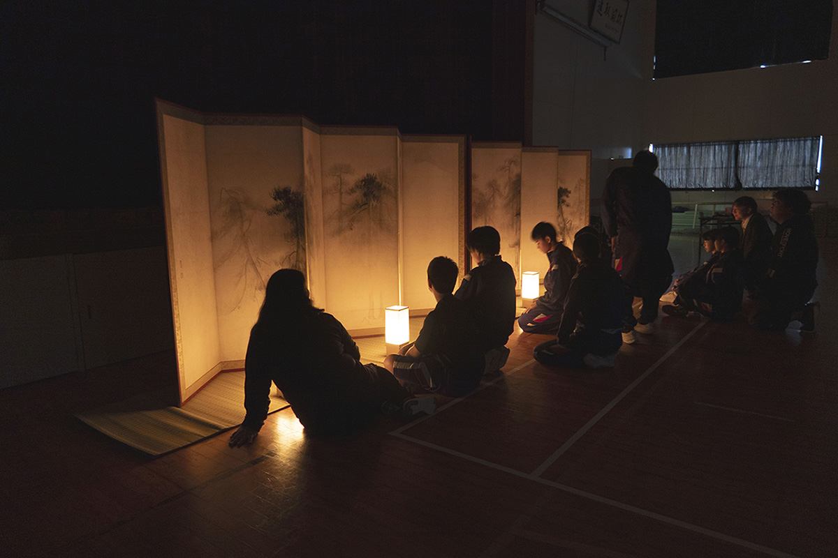 体育館のカーテンを閉め、和ろうそくの灯りをイメージした光に照らされた屏風の前に座り、松林図屛風が描かれた時代の人と同じ見方を体験しました。その後、白っぽい光や自然光などさまざまな光のもとで松林図屛風を鑑賞しました。光の変化によってその都度、表情を変える松林図屏風に驚き、細部まで熱心に見入る生徒が大勢いました。また、自分のお気に入りの松林図鑑賞場所を探してもらったところ、生徒たちは屏風の真横や中央、至近距離など思い思いの場所で松林図屛風を楽しんでいました。いずれの学年の生徒も屏風に描かれているもの、季節、時間など積極的に考え、松林を吹き抜ける風や地面からたちのぼる湿った匂いを感じるという発言も聞かれ、その豊かな想像力は後半の制作につながり、表現にこだわった作品が数多く作られました。