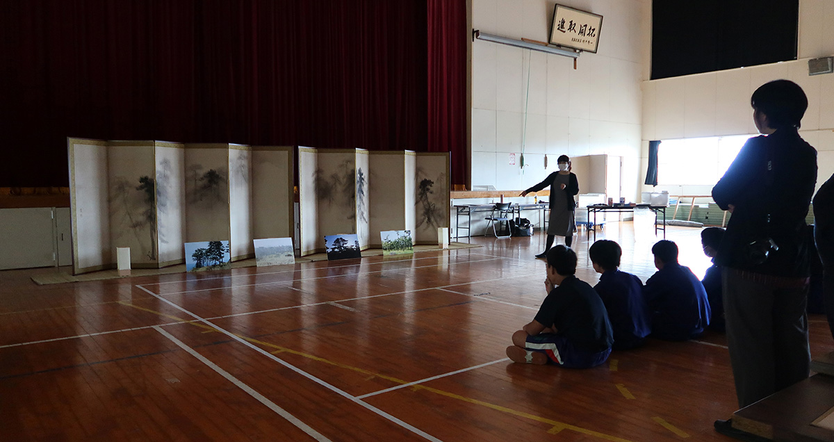 ご担当の伴先生から「屏風の鑑賞活動を通して、日本の美術を身近に感じ、日本人の自然に対する美意識などを理解しながら、見方や感じ方を深める。」というご希望をいただき、プログラムを実施しました。講師は、2学年および3学年を小島有紀子(文化財活用センター企画担当)、1学年を神辺知加(文化財活用センター企画担当)が務めました。