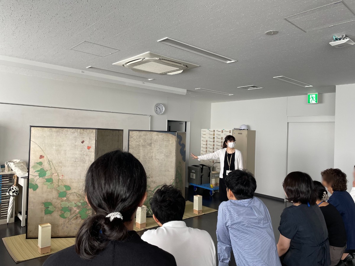 講師は小島有紀子、サポートは藤田千織(文化財活用センター企画担当課長)、神辺知加、岡﨑瑠美(文化財活用センター企画担当)が務めました。事前打合せは講師往訪で1回のほか、その後の調整はメール・電話でやり取りを行ない当日を迎えました。研修は9:00~12:00(途中休憩1回)で行ない、複製品は「風神雷神図/夏秋草図屛風」を使用した研修内容としました。質問は随時お受けする形で、以下の時間配分で進行しました。