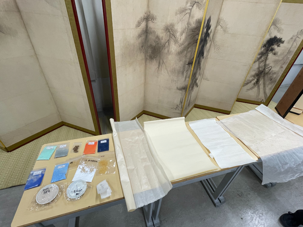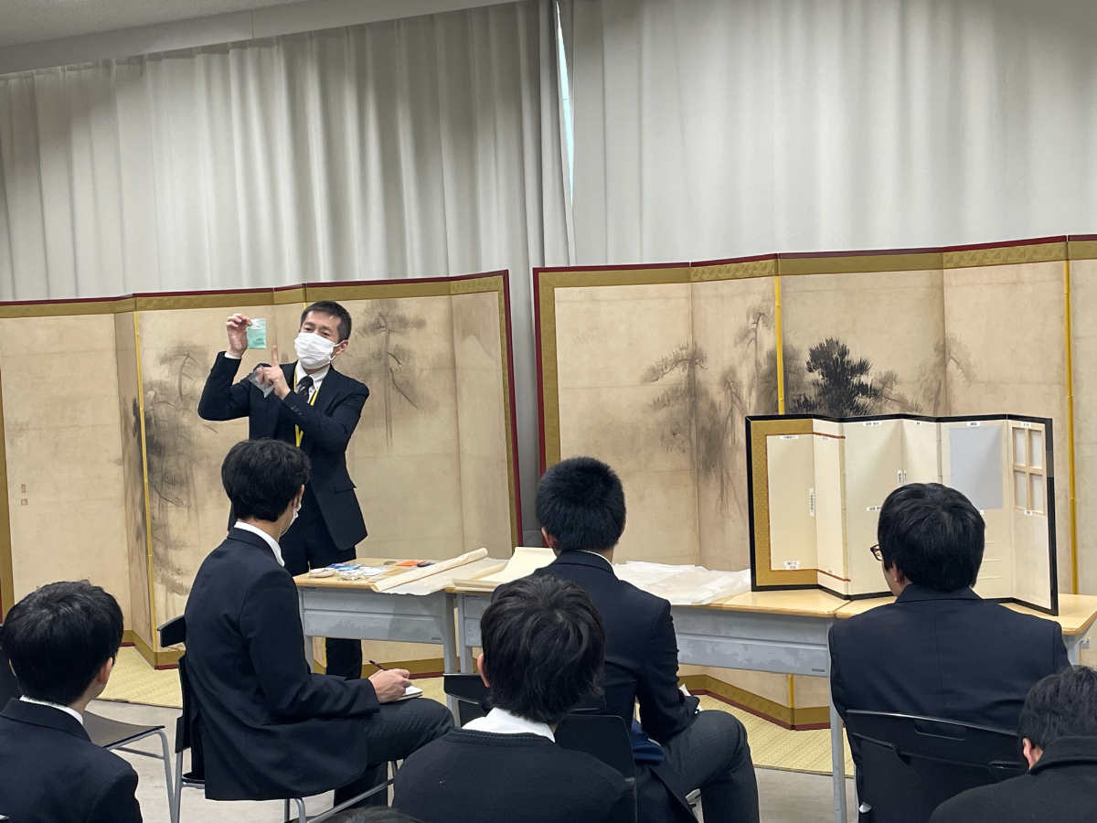 90分の特別授業を前後半に分け、前半を東京国立博物館並びに文化財活用センターが担当し「文化財」「博物館」「学芸員(研究員)」が抱える課題をお話し、実際に文化財が抱える問題の一つの問題提起として、修理修復に使用される素材を触ってもらい、今現在、生産や収穫、技術の継承がどういう状況であるかをお話ししました。後半はキヤノン株式会社に担当いただき、企業の仕事や社会貢献、技術について実際もカメラレンズを用いながら説明いただきました。
