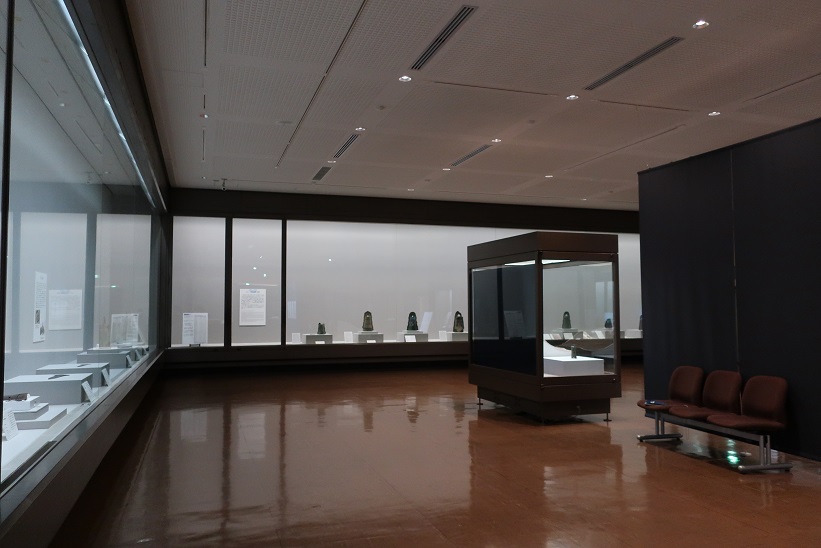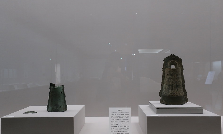 外縁付鈕2式銅鐸 弥生時代(中期)・前2~前1世紀 兵庫県神戸市東灘区森北町出土(左)と突扁平鈕式銅鐸 弥生時代(中期)・前2~前1世紀 兵庫県神戸市東灘区渦森台出土(右)展示の様子。どちらも東京国立博物館蔵