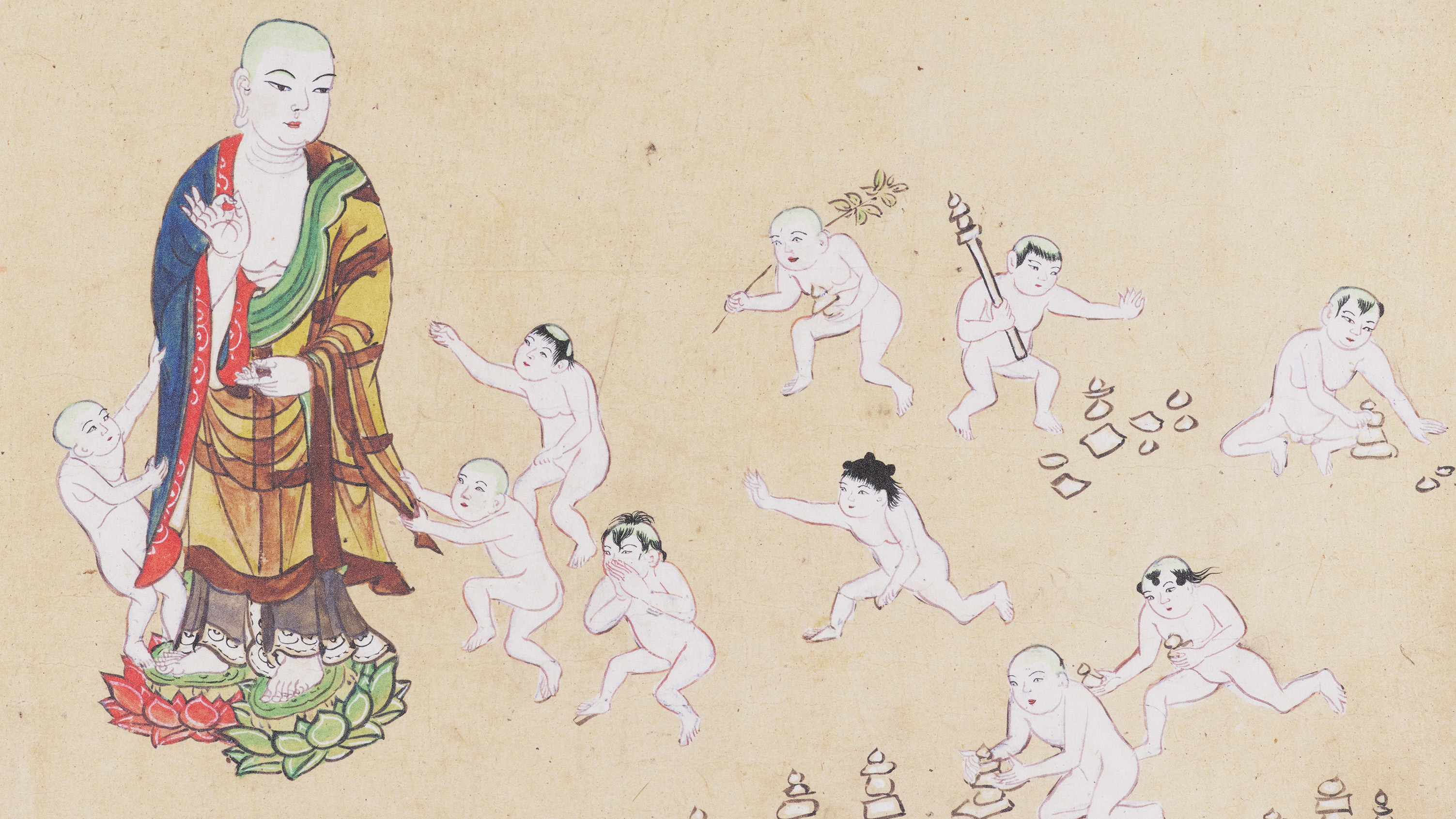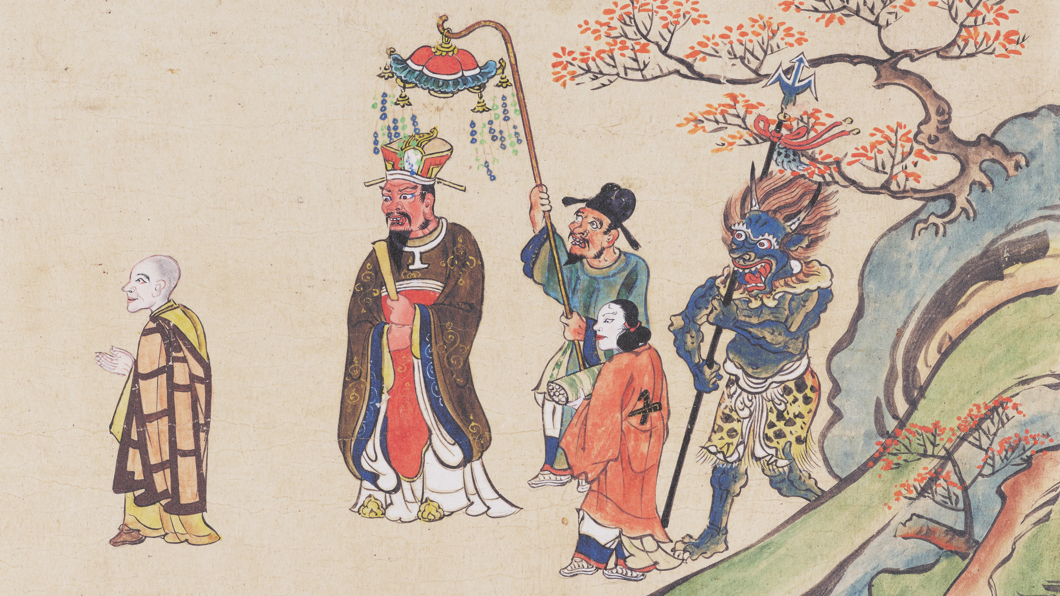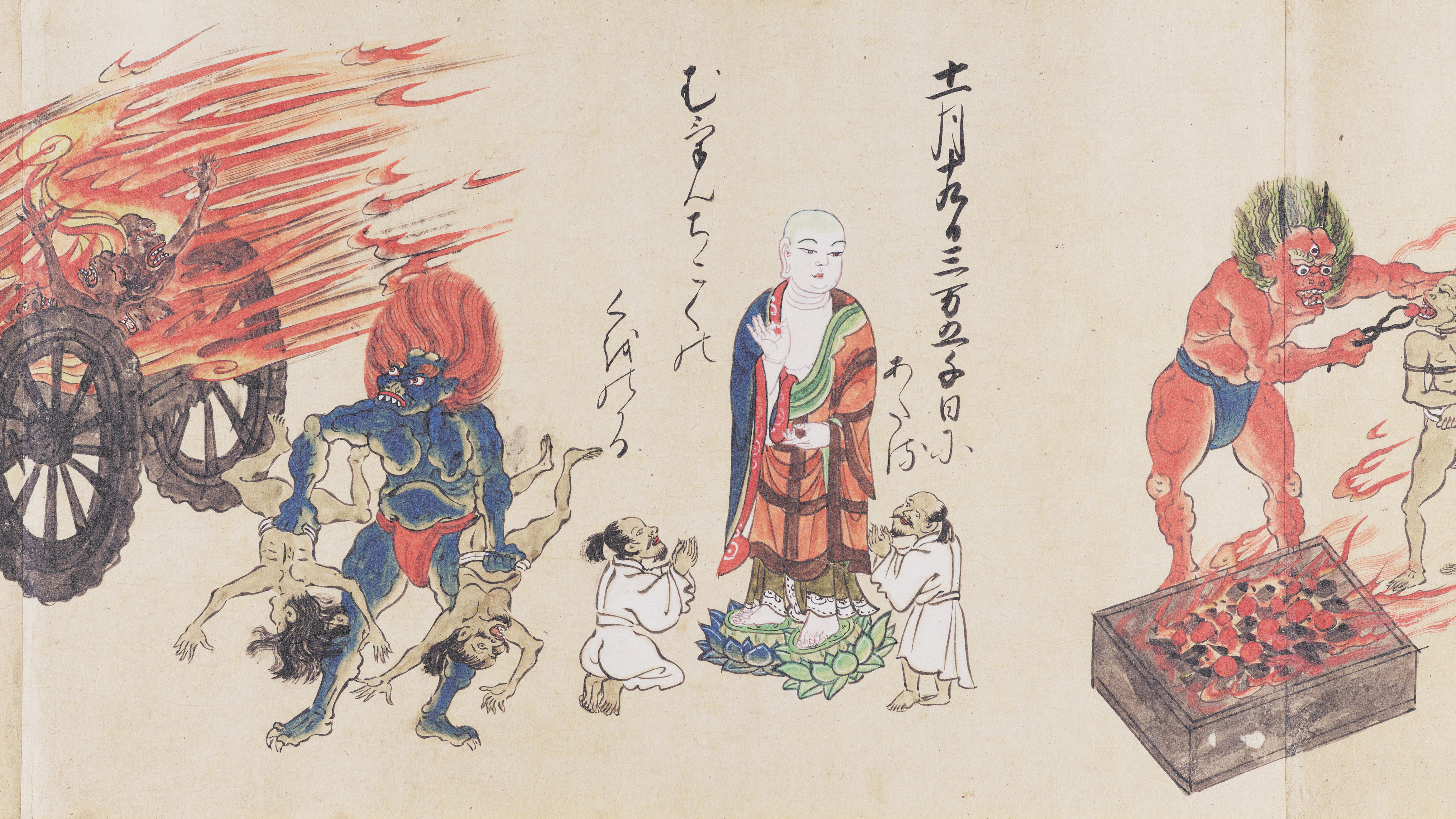 奈良・金剛山寺(矢田寺)の本尊である彫像の地蔵菩薩像(矢田地蔵)のご利益を描く絵巻。閻魔(えんま)の招きに応じて地獄へ出向いた満米(まんまい)という僧が、地蔵が亡者を地獄から救済するのを目の当たりにする様子を描く。本巻は、巻頭に地獄で閻魔と対面する満米を描き、続いて閻魔とともに地獄巡りを始める場面を描いたあと、一月ごとに、さまざまな地獄から亡者を救う矢田地蔵を描く。この構成は、矢田地蔵へ月詣でを行えば、地蔵が地獄から救済してくれるという月詣でのご利益を強調するものであり、布教のための絵巻といえよう。描写から奈良の絵師が描いたと考えられる。 ―奈良国立博物館収蔵品データベースより