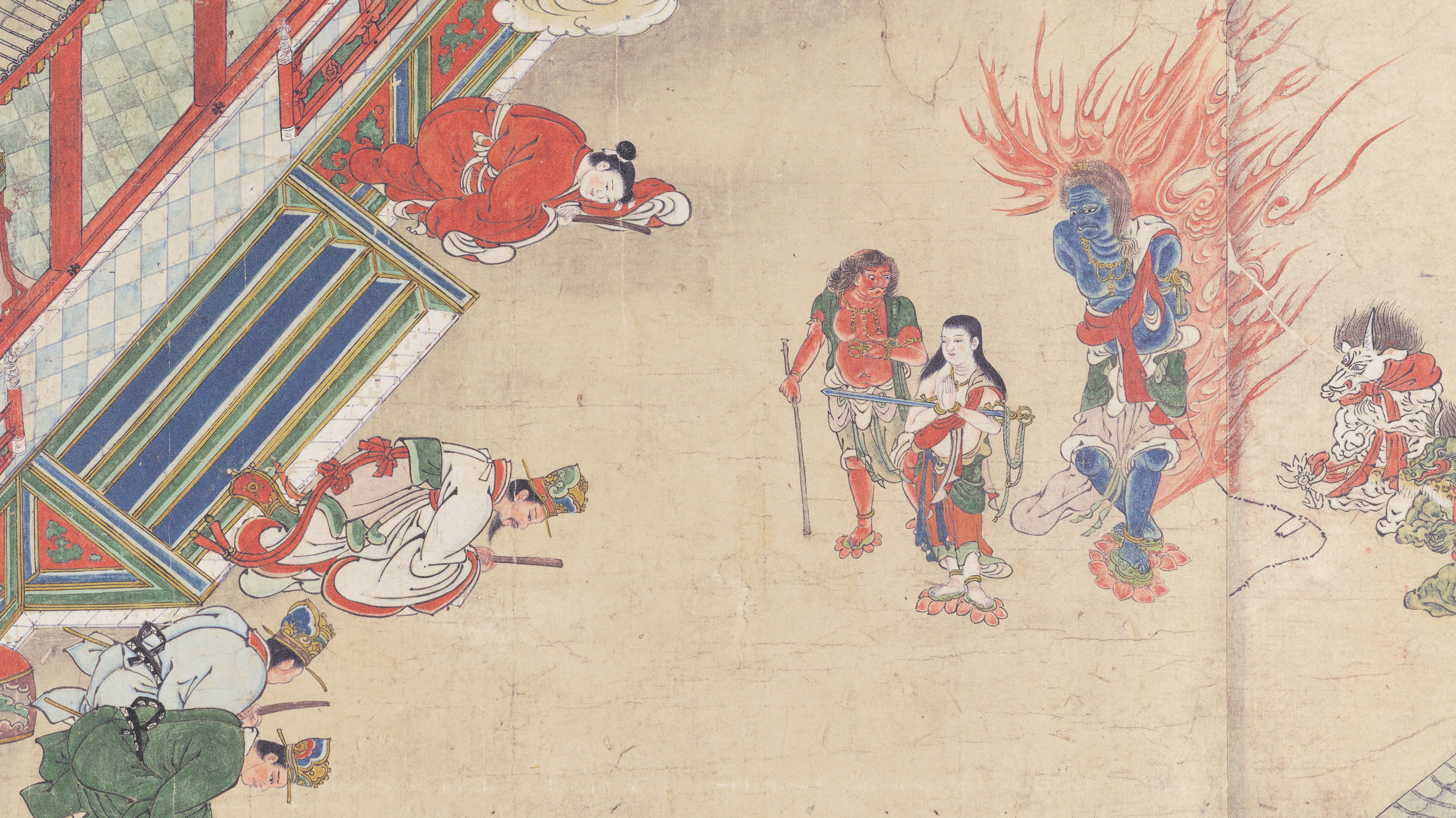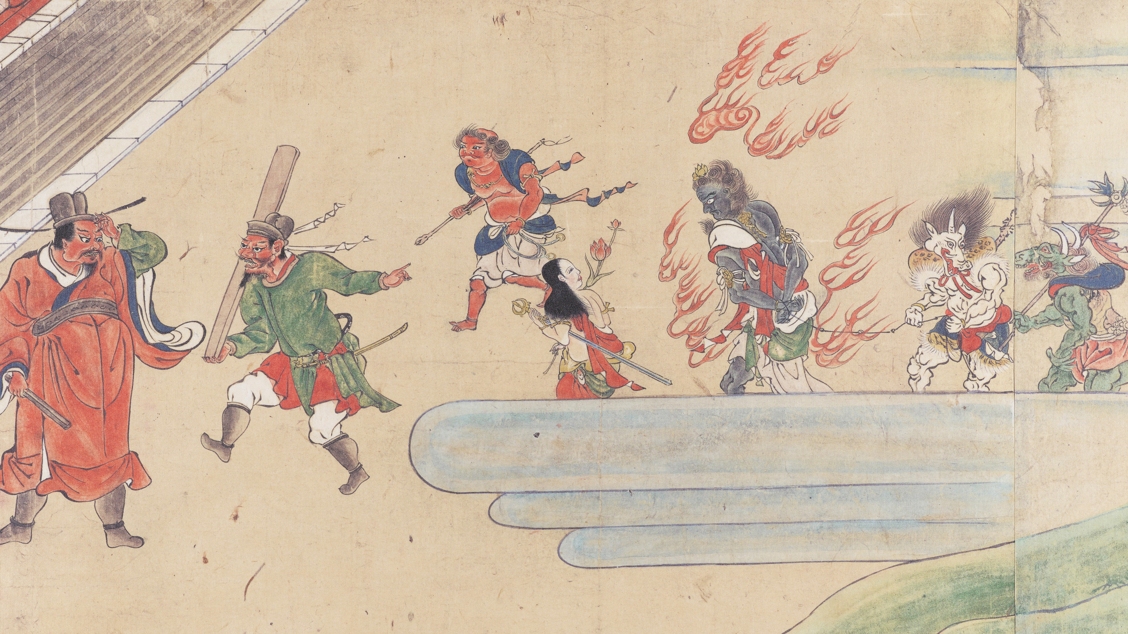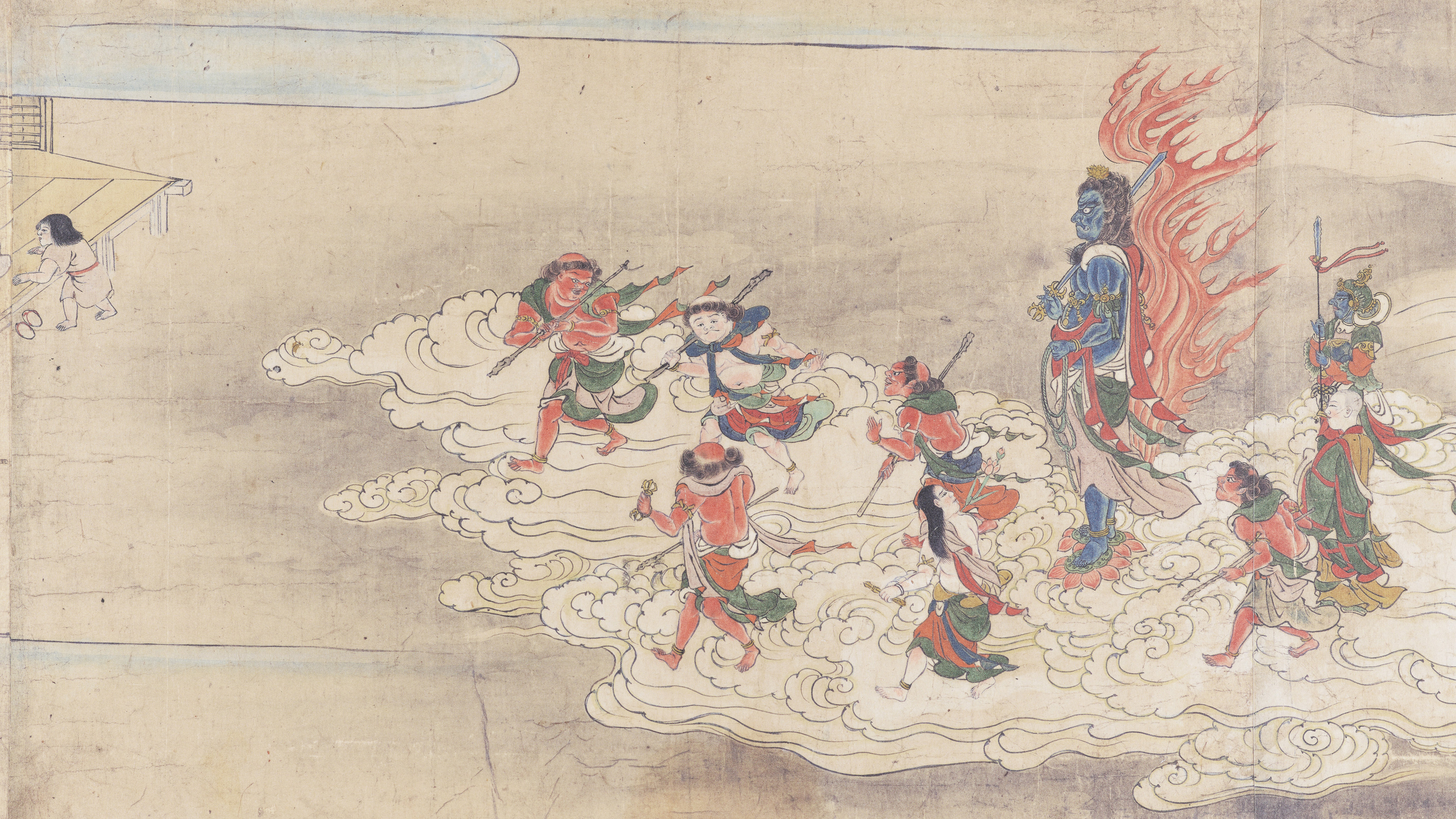 不動明王のご利益を描いた絵巻物。師の身代わりに病となった三井寺(みいでら)(滋賀・園城寺)の僧・証空(しょうくう)は、日頃信仰していた絵画の不動明王像が、血の涙を流し、さらにその病を引き受けてくれたために助かる。病を得た不動明王像は、獄卒(ごくそつ)によって地獄に連れて行かれるが、閻魔王(えんまおう)に恭敬(きょうけい)され地獄から放たれる。これは中世のいくつもの説話集に採用された有名な説話で絵巻の作例も複数伝存する。平安時代には師の病を陰陽師(おんみょうじ)が証空に移し、のち二人とも平癒する話だったが、後には陰陽師には証空を救えず、不動がそれを叶えたという構成が主流となる。