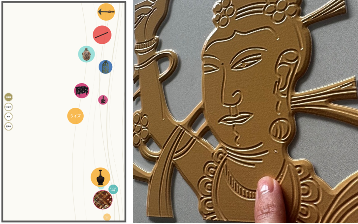 画面の上部からゆったりと流れてくる宝の玉に触れ、鑑賞したい文化財を選択すると、高精細な画像を拡大・回転しながら、細部までじっくりと鑑賞できます。また、画像を鑑賞するだけでなく、クイズなどのアクティビティや隠れたエピソードもお楽しみいただけます。