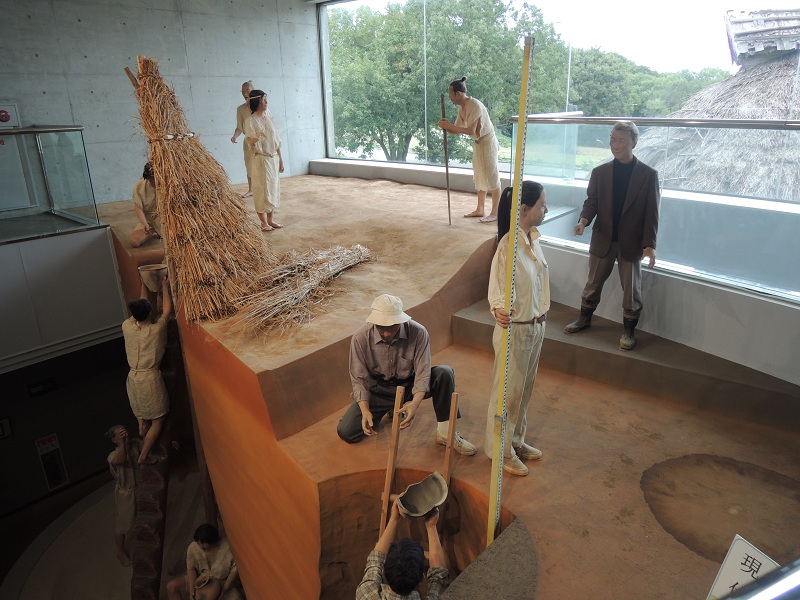 この常設展の最後には、綾羅木郷遺跡を発掘調査した風景と、弥生時代の人びとの生活の様子が対になるように、再現展示をしています。当時発掘に携わった考古学者も展示のモデルとなっています。