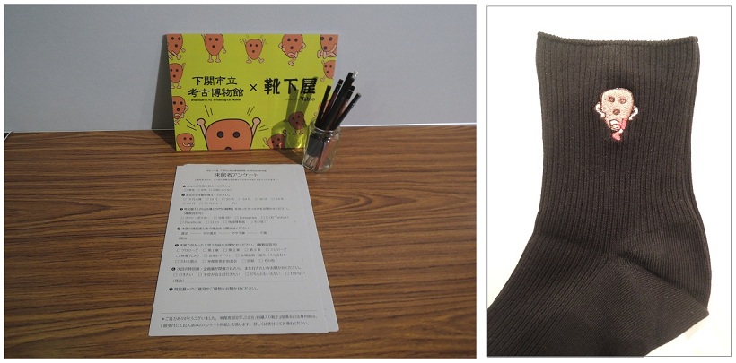なお、展示の最後には、アンケートが置いてありまして、アンケート回答者の中から抽選で10名様に「ぶえ吉」刺繍入り靴下がプレゼントされるそうです。この「ぶえ吉」とは、下関市立考古博物館公式マスコットでして、冒頭に説明しました土製の笛(陶塤)の、ゆるキャラです。
