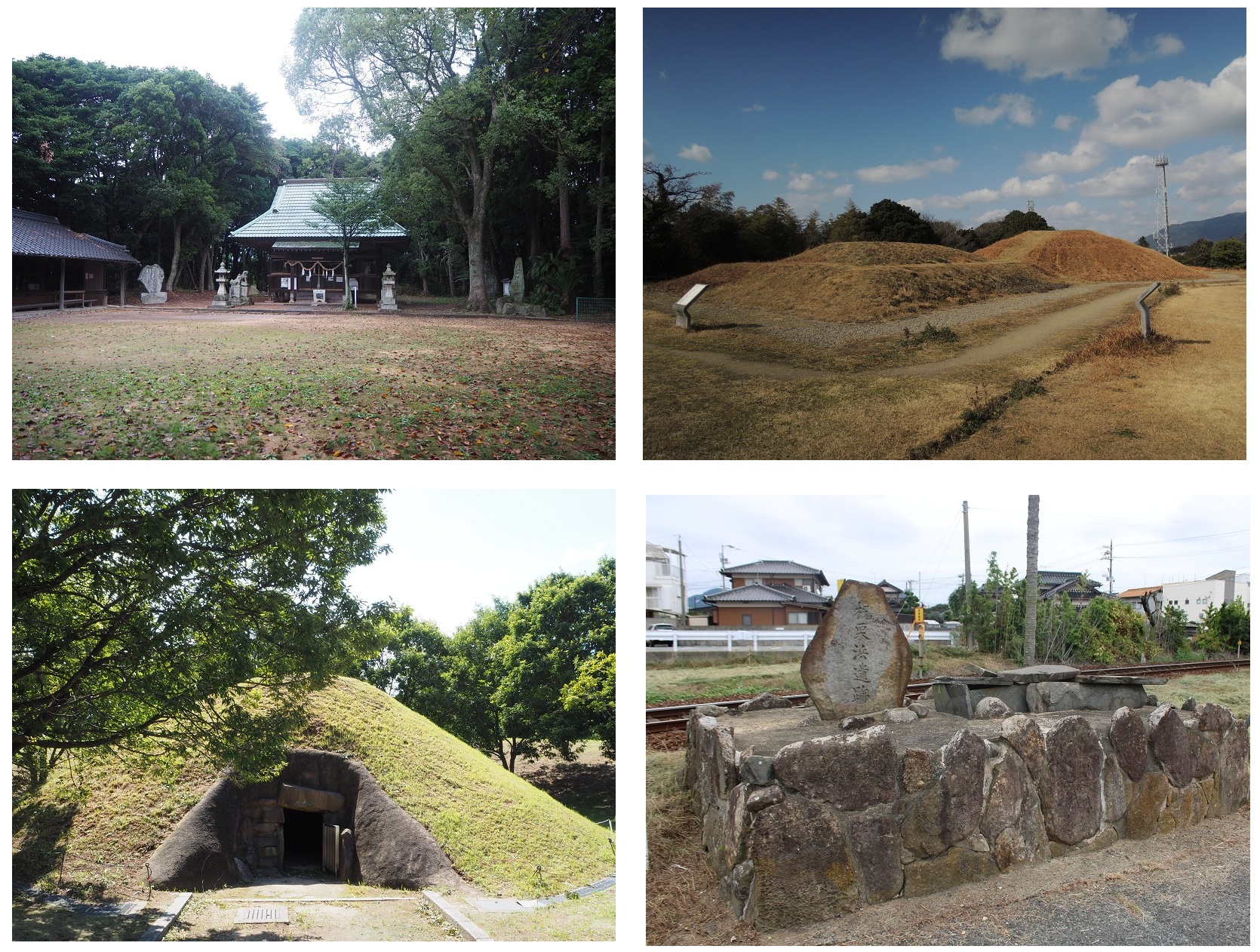 【下段】[左] 岩谷古墳。石室内も見学できます。 [右] 梶栗浜遺跡の石棺