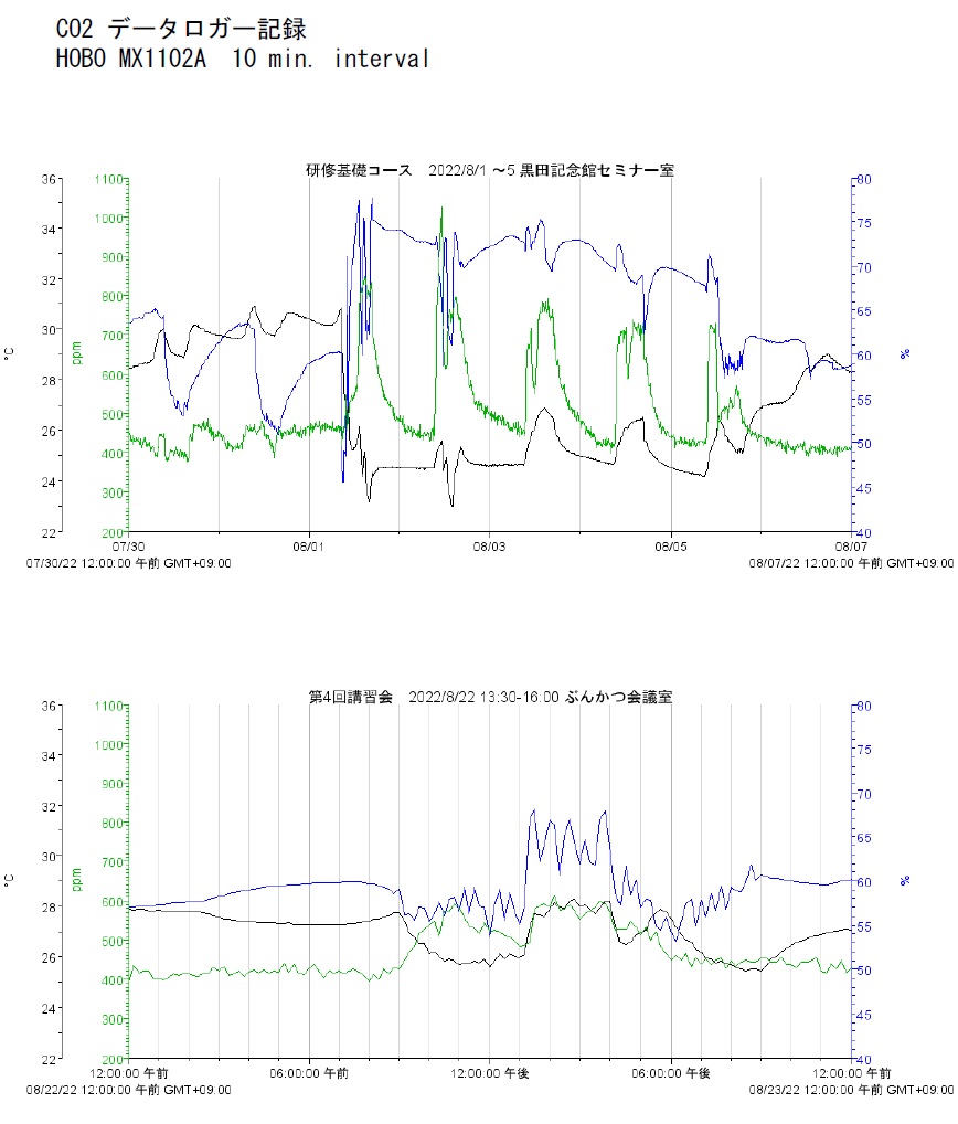 令和4年(2020)8月に開催した研修会と講習会会場での二酸化炭素濃度推移の記録(緑線)です。