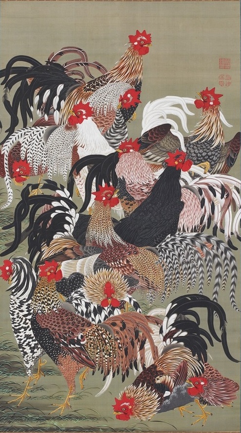国宝「動植綵絵」のうち《群鶏図》、伊藤若冲筆、江戸時代・18世紀、絹本着色、皇居三の丸尚蔵館